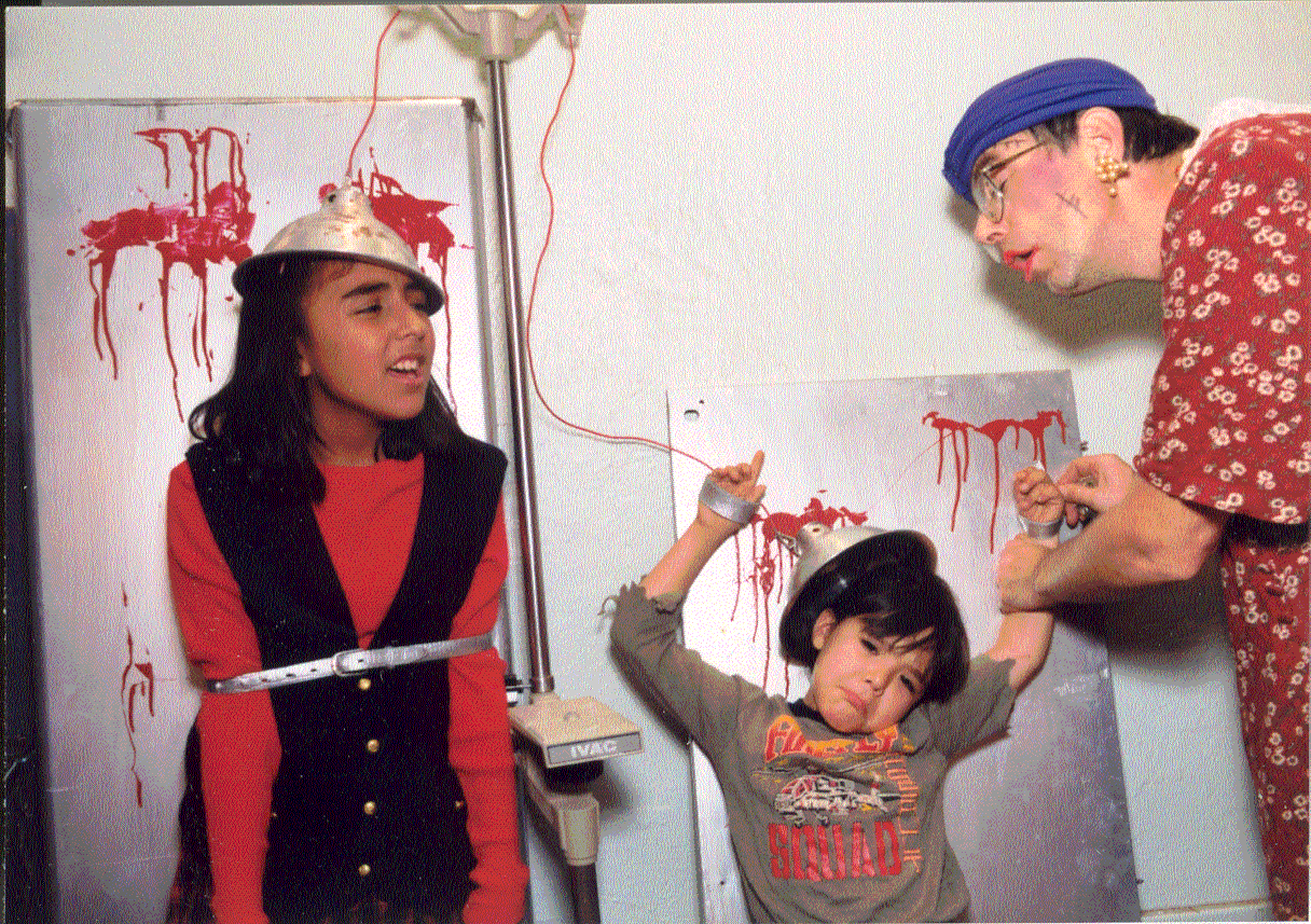 (Upon countdown, kids immediately begin screaming and struggling against their cuffs,